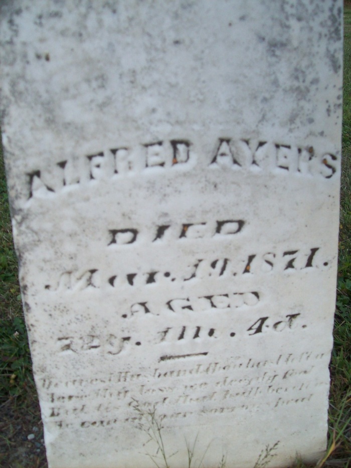 - Alfred Ayers Headstone Wheeler Cemetery, Row 6, Grave 3; Headstone Inscription: 71y 11m 4d