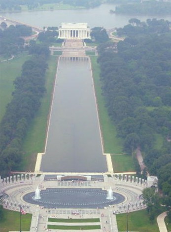 View from atop the Washington Monument looking across at the Lincoln Memorial; down at the World War II Memorial